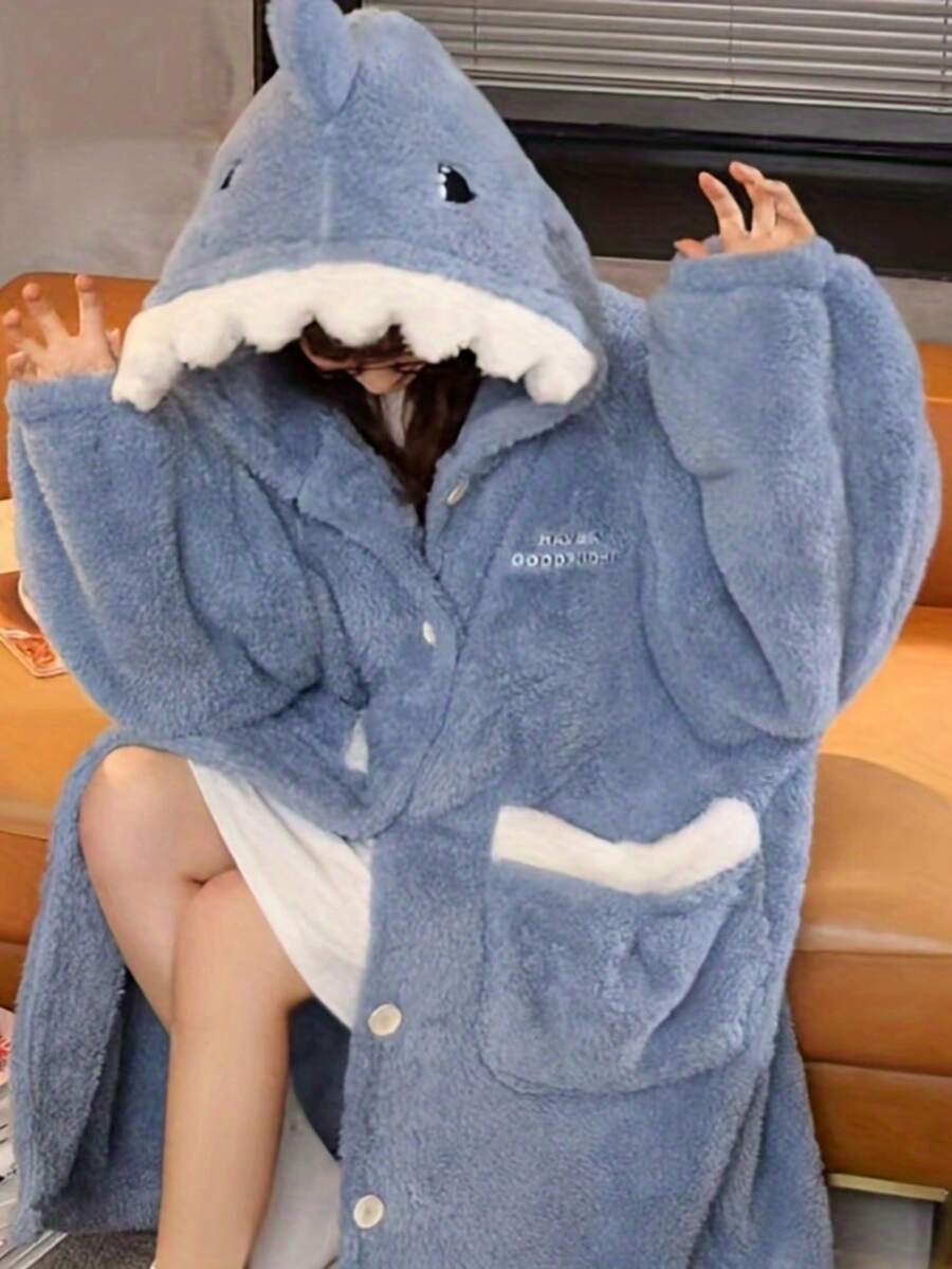 1 Pc Women's Cozy Shark Themed Coral Fleece Robe, Shark-Themed Hooded Rob, Thickened Shark Hooded Long Plush Warm Cartoon Suit, Cute And Interesting Cartoon Shark Hooded Warm Jacket, Long Sleeves & Pockets For Home Lounge, Birthday, New Year Gift, Robe Can Be Worn As Blanket, Winter/Spring, Valentine's Day Gifts, Gift For Women Bathroom Decor