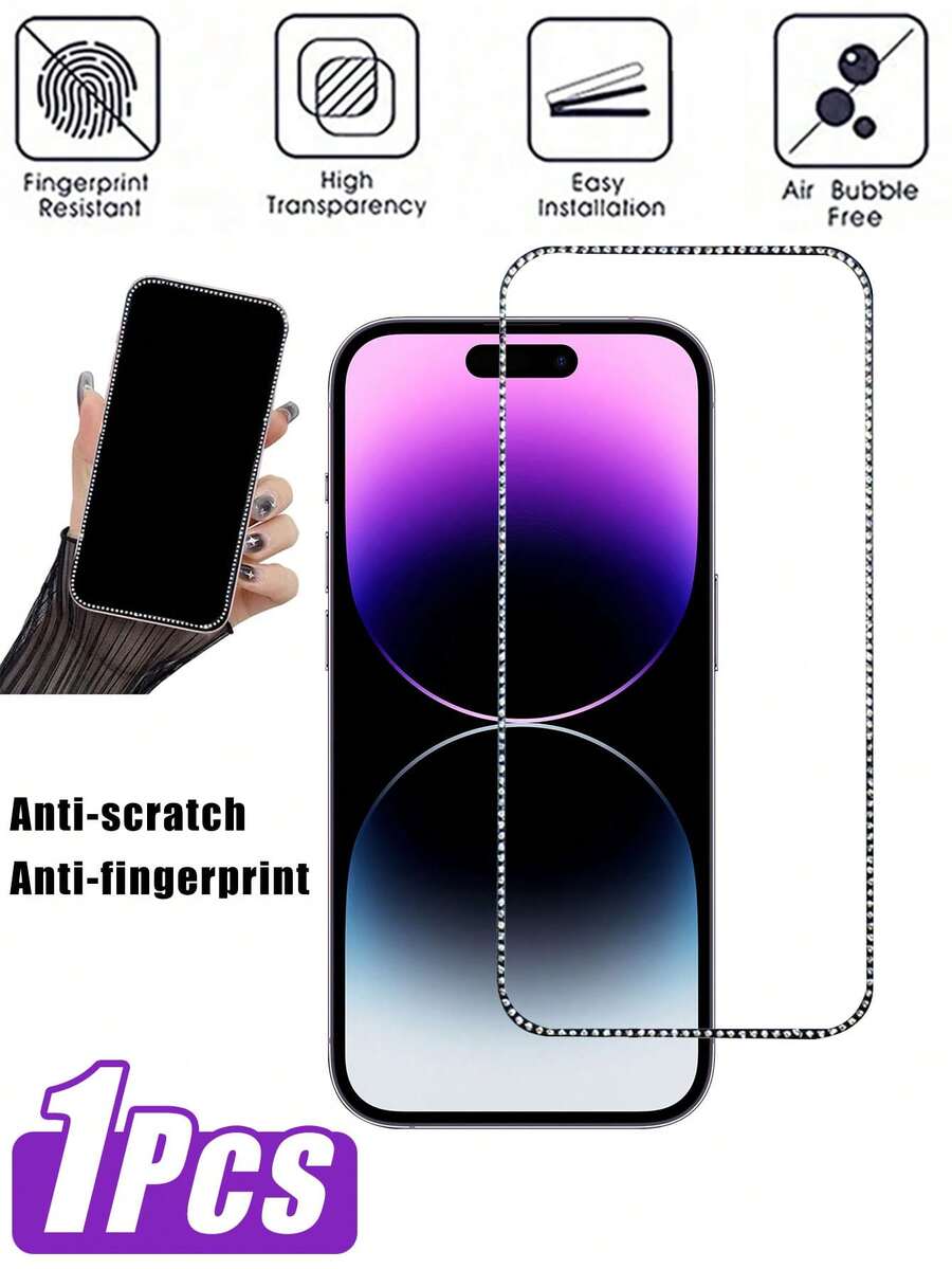 1pc Black Shiny Rhinestone Framed Tempered Glass Screen Protector, Explosion-Proof Easy To Apply, Compatible With IPhone 16/16 Plus/16 Pro/16 Pro Max/15/15 Pro/15 Plus/15 Pro Max/14/13/12/11, Birthday/Gift For Family & Friends, Tempered Glass Material, Phone Screen Protector, Phone Accessories, Waterproof, Shockproof, Anti-Fall, Scratch-Resistant, Anti-Fingerprint, Full Coverage