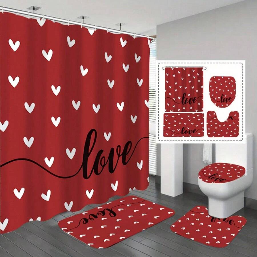 1/4 Pcs Heart Print Bathroom Curtain Set, Includes Shower Curtain, 12 Hooks, High Quality Bathroom Mat, Toilet Seat Cover, And U-Shaped Rug, Cartoon Decor, Machine Washable, Multiple Sizes Available