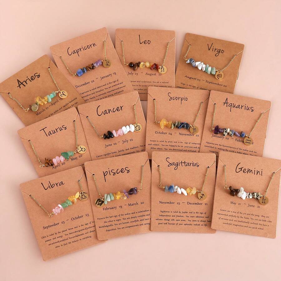1Pc Bohemian Style Natural Stone 12 Constellation Necklace Stainless Steel Pendant With Constellation Card For Women For Daily Wear