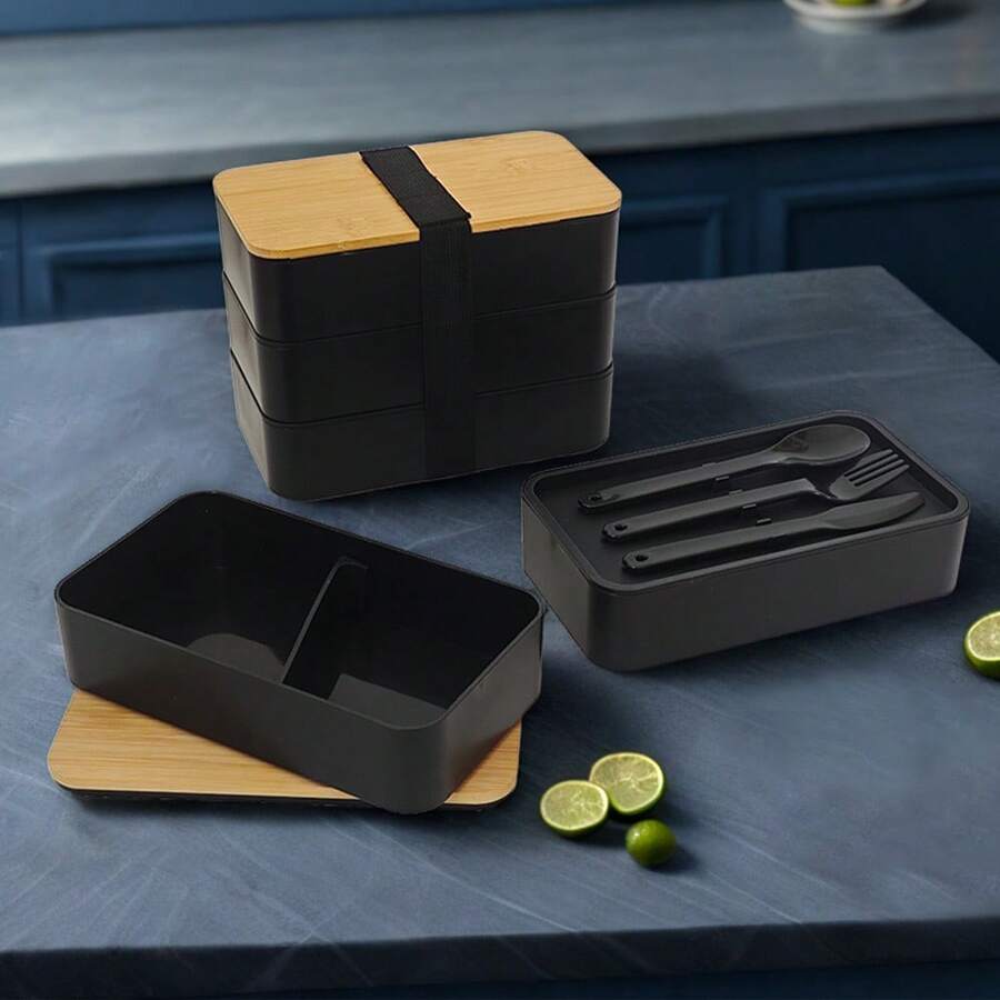 1pc Portable Leak-Proof Lunch Box With Cutlery, Japanese Bento Box, Adult Bento Box, School Lunch Box, Bamboo Lid Lunch Box, Outdoor Travel Insulated Bag, Stackable, Reusable, Suitable For Back To School, Outdoor Travel, Work, Kitchen Food Storage, School Supplies