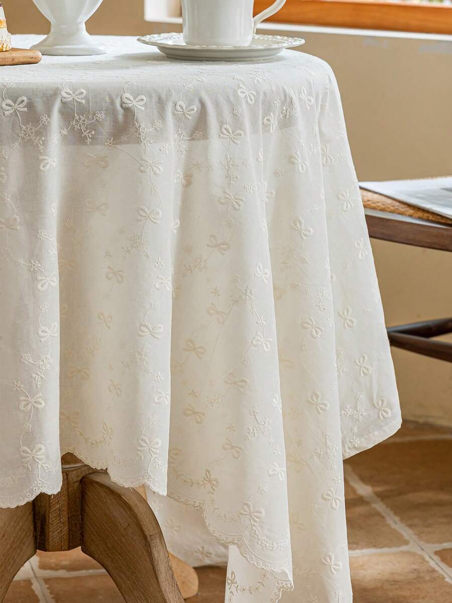 1pc White Solid Color 3D Embroidered Bow Flower Tablecloth, Fresh Elegant Romantic Style With Skirt, Suitable For Wedding, Daily Home Decor