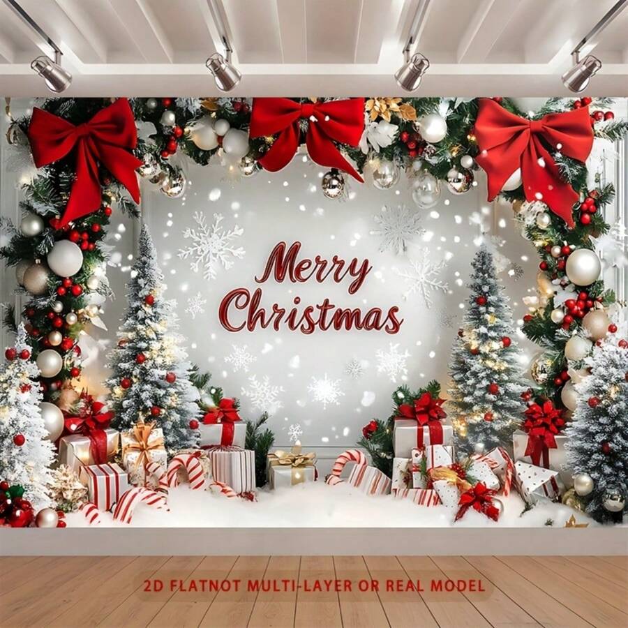 2D Flat, 1pc Holiday Christmas Party Banner - Multi-Size Polyester Backdrop With Snowy Scenery, Decorative Bows And Gift Wraps, Suitable For Home And Room Wall Decor, Christmas Decorations