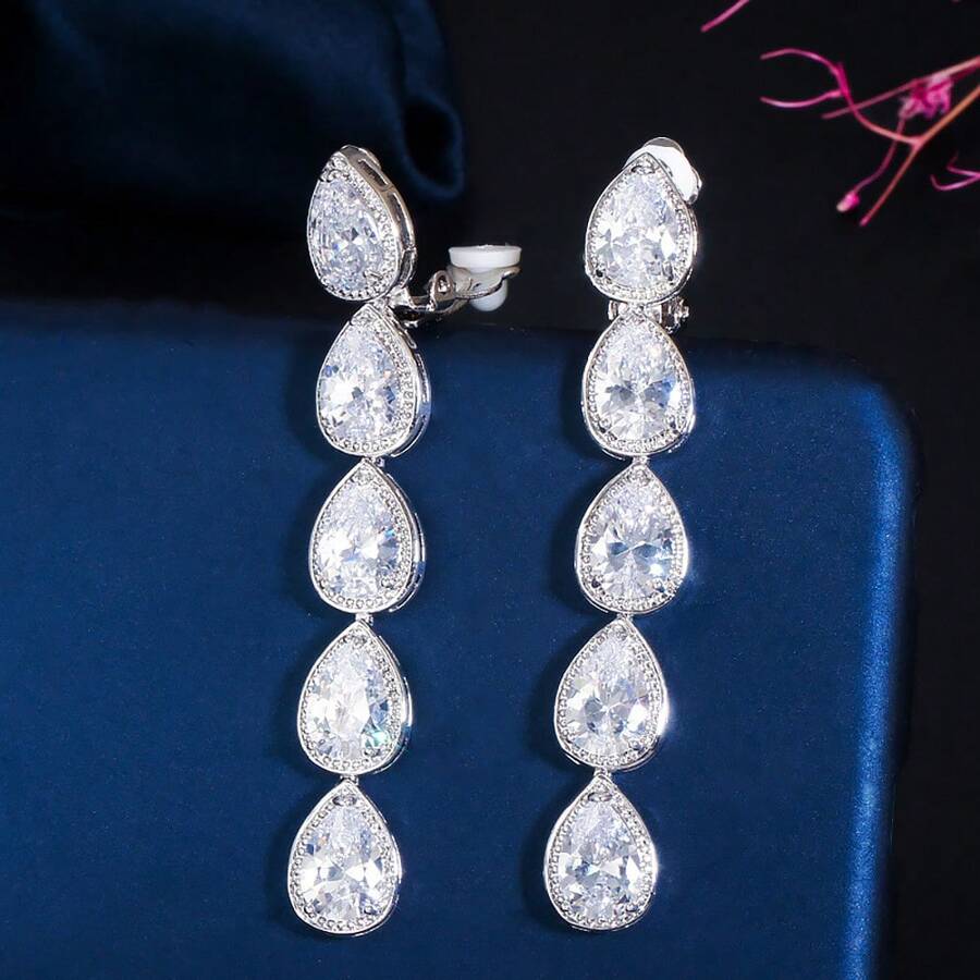 SEQUITO 2Pcs High Quality Silver Plated Paved 5pcs AAA Cubic Zirconia Long Water Drop No Pierce Clip On Earrings Women Non Hole Ear Jewelry For Wedding Party