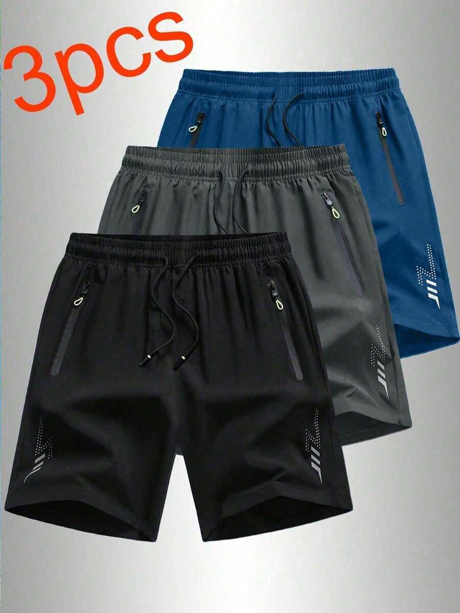 • 3 Pairs Of Men's Sporty And Casual Loose Quick-Drying Shorts, With Reflective Strip Design, Pocket, Zipper And Drawstring At The Waist, Suitable For Fitness, Running And Outdoor Activities.