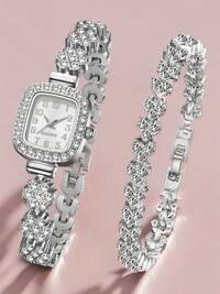 2pcs/Set, Ladies' Elegant Retro Watch Set, Ladies' Quartz Watch With Rectangular Dial And Stainless Steel Strap, Diamond Inlaid Alloy Bracelet, Suitable For Daily Wear And Decoration, Casual, Party, Holiday, Birthday, Dinner And Other Occasions, Or As A Holiday Gift, Mother's Day Gift #2 Bestseller