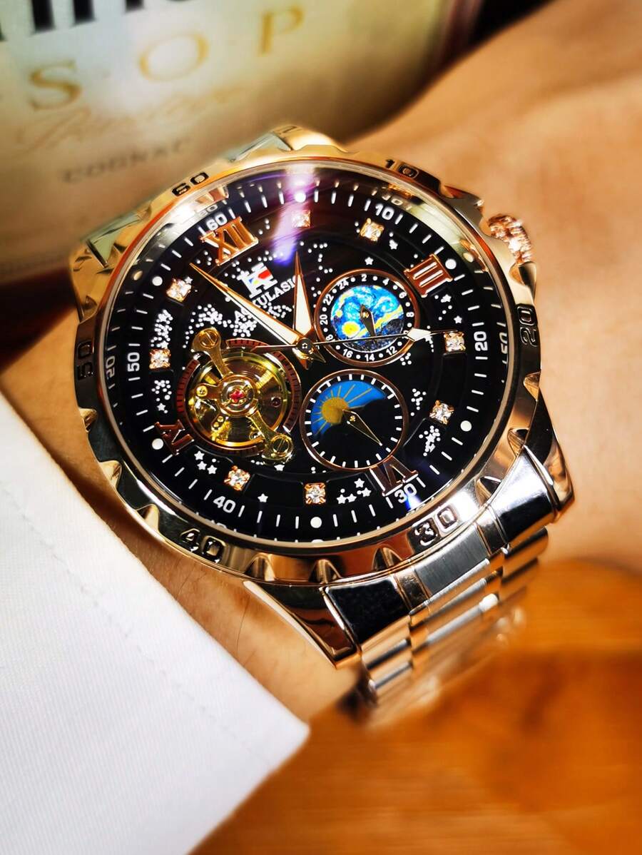 AOKULASIC 1pc Luxury Starry Sky Moon Phase Display Tourbillon Hollow Automatic Mechanical Men's Watch, Top Brand, Stainless Steel Strap, Rose Gold Case, Business & Casual Watch, Gift