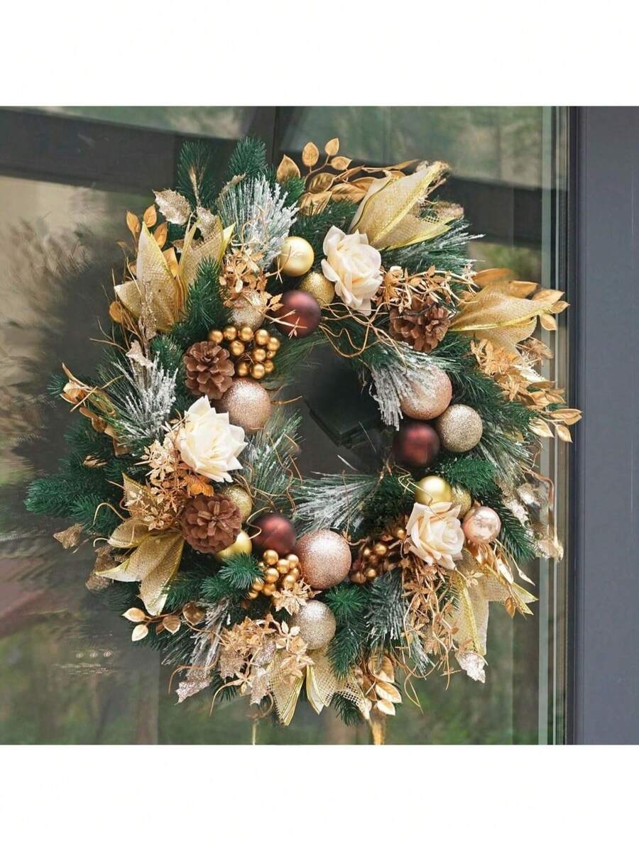 Artificial Champagne Gold Christmas Wreath, 40cm/15.8in Christmas Garland Realistic Evergreen Front Door Outdoor Wreath With Ball Ornaments, Flower, Roses Berries Golden Leaves Ribbon Pine Cones, Door Ring Decor Christmas Decorations, Christmas Presents Christmas Gifts For Women