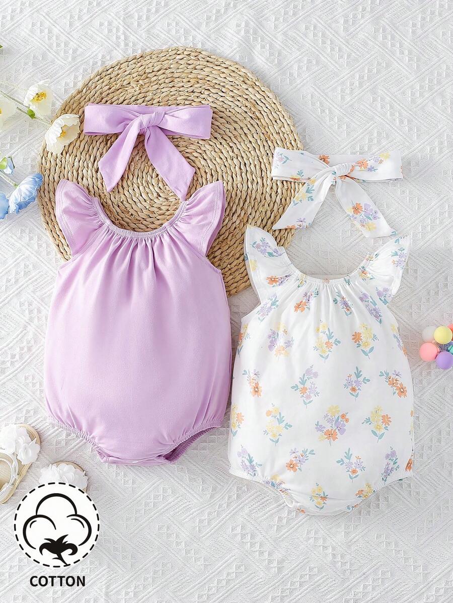 Baby Girls' Cute And Elegant Flower Printed Flutter-Sleeve Romper With Hairband Set