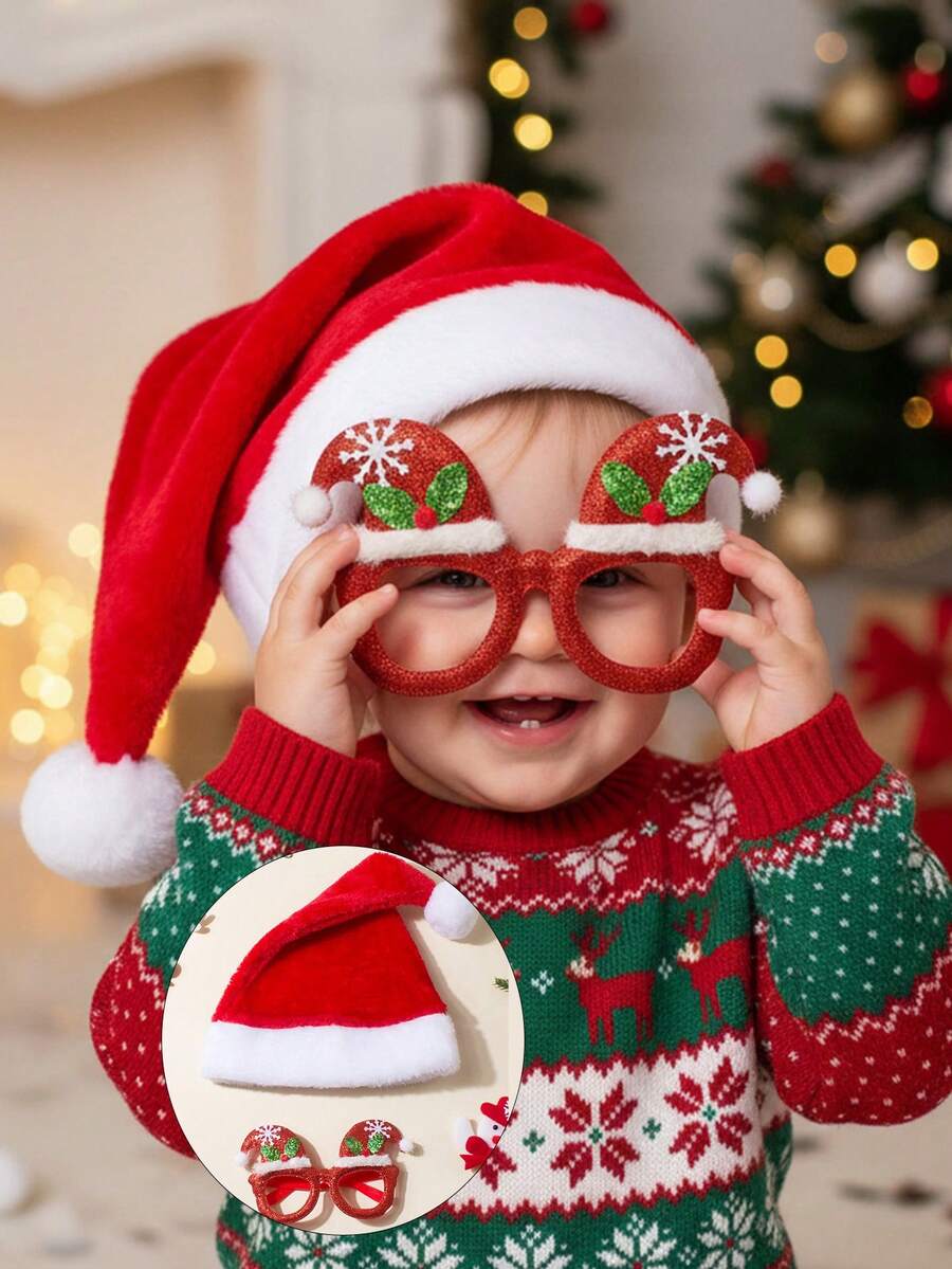 Children's Christmas Hat + Christmas Glasses Set For 1-5 Years Old, Baby Christmas Decoration Christmas Gift, Kid Xmas Gift,Boys And Girls Universal, Girl Fall Dress Red Accessories