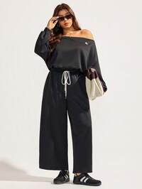 SolflareSolflare 2026 Spring/Summer New Casual Everyday Wear, Party, Date, Birthday, Music Festival, Back To School, Commute, Vacation Multi-Occasion Flounce Short Sleeve Romper, Off Shoulder, Soft Cotton Blend, Loose Fit, Long Length, Black, Plus Size