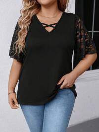 SHEIN LUNE Elegant Work Wear Plus Size Women Blouse, Cute, Sexy, Fashion Versatile, With Comfortable Fabric, Lace Sleeves, V-Neck, Criss-Cross Design, Black, Suitable For Spring, Summer, Autumn #2 Bestseller