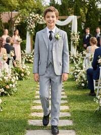 5-Piece Suit Set For Teenage Boys, Toddler Tuxedo Formal Wear, Ring Bearer Outfit, Wedding Suit Jacket, Vest, Pants, Shirt, Tie, Formal Suit, Suitable For Teenage Boys Birthday, Wedding, Graduation Ceremony, Wedding Guest, Light Gray, Size 6-16 Years