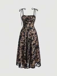 SHEIN MOD Beige Satin Midi Dress With Black Floral Lace Overlay, Adjustable Tie Shoulder Straps, Fitted Bodice, Flared Skirt, Elegant, Romantic, Evening Wear, Cocktail Dress, Formal Occasion, Feminine, Classic, Vintage Inspired, Lightweight, Breathable, Sophisticated, Party, Wedding Guest, Stylish, Timeless, All-Season, Chic #1 Bestseller