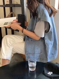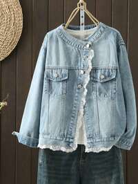 Women's Denim Jacket, Long Sleeves, Collarless, Washed Finish, Loose Fit, Plus Sizes, Flattering, Stylish, Mori Girl Style, Denim Coat, Blouson, Casual, Street Style, Versatile, Perfect For Parties And Outings.#4 Bestseller