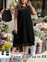 SHEIN CURVE+SHEIN CURVE+ Ladies In Plus Size, Elegant Parties For Spring, Summer, Autumn, And Winter, Weddings, Cocktail Parties, Bohemian Beaches, Gold Standing Collar Woven Flour A-Line Dresses, Long Plus Size Dresses, Women's Dresses