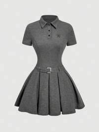 SHEIN MODSHEIN MOD Vintage Grey Polo Collar Short Sleeve Dress With Belt - Embroidered Decor, Pleated And Accordion Style, Old Money Aesthetic, Preppy Vibe, 70s Inspired, Sweet And Cute, Perfect For School Wear, Commuting, Parties, And Dates,Business Casual Woman,Office Outfits For Women