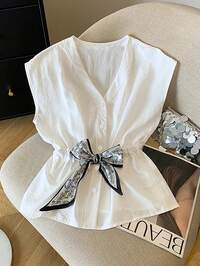 SHEIN MODSHEIN MOD Ladies' White Shirt With Necktie Decorated Front Button,Back To School Shirts,Fall Women,Office Wear,Going Out Tops,,Women Shirts,Preppy Tops,Bachelorette,Rave Festival,Work,Concert